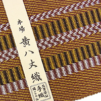 草木染の絹織物で東京都八丈島に伝わっています。 黄八丈は三色に染めた糸を縞柄が格子柄になるように作ることが特徴的で、独特の模様を生み出すことができます。 一般的な絹織物の代名詞として八丈という言葉が使用されていましたが、これが島名の由来となるほど当時から八丈島では絹織が盛んに行われていました。 江戸時代後期に脚本化された恋娘昔八丈においてこの織物が使用されたことが流行に火をつけたと言われ、もっとも有力な説となっています。